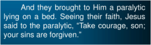 And when he returned to Capernaum after some days, it was reported that he was at home. And many were gathered together, so that there was no more room, not even at the door. And he was preaching the word to them. And they came, bringing to him a paralytic carried by four men. And when they could not get near him because of the crowd, they removed the roof above him, and when they had made an opening, they let down the bed on which the paralytic lay. And when Jesus saw their faith, he said to the paralytic, “Son, your sins are forgiven.” Now some of the scribes were sitting there, questioning in their hearts, “Why does this man speak like that? He is blaspheming! Who can forgive sins but God alone?” And immediately Jesus, perceiving in his spirit that they thus questioned within themselves, said to them, “Why do you question these things in your hearts? Which is easier, to say to the paralytic, ‘Your sins are forgiven,’ or to say, ‘Rise, take up your bed and walk’? But that you may know that the Son of Man has authority on earth to forgive sins”–he said to the paralytic– “I say to you, rise, pick up your bed, and go home.” And he rose and immediately picked up his bed and went out before them all, so that they were all amazed and glorified God, saying, “We never saw anything like this!”