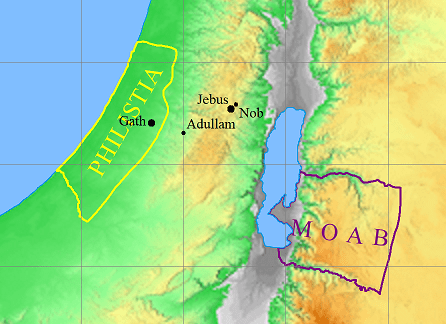 David escaped the hands of King Saul, running to the Philistine country, to the King of Gath for a possible hideout, or place of safety. That didn’t turn out, and he shamed himself in finding escape. Now he is taking his parents to the country of Moab.