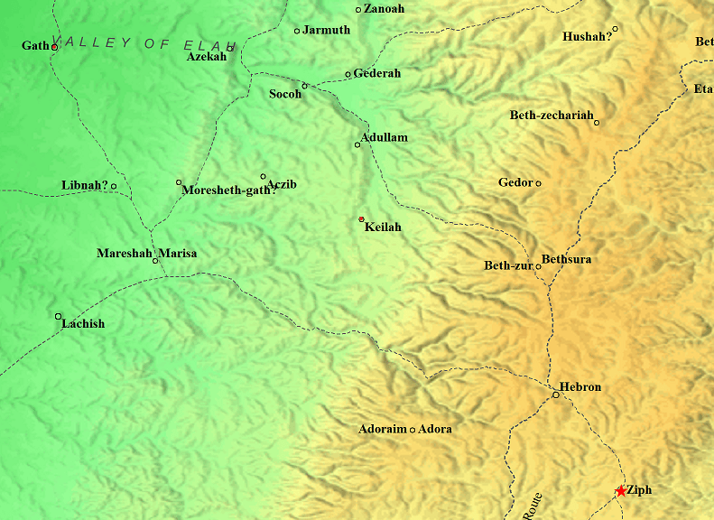 David and his 400 men travelled to Keilah, fought the Philistines, won a mighty victory and rescued the city from devastation. But news gets around, and Saul hears that David is in Keilah. Hot diggity dog – Saul starts rounding up an army to come get him.