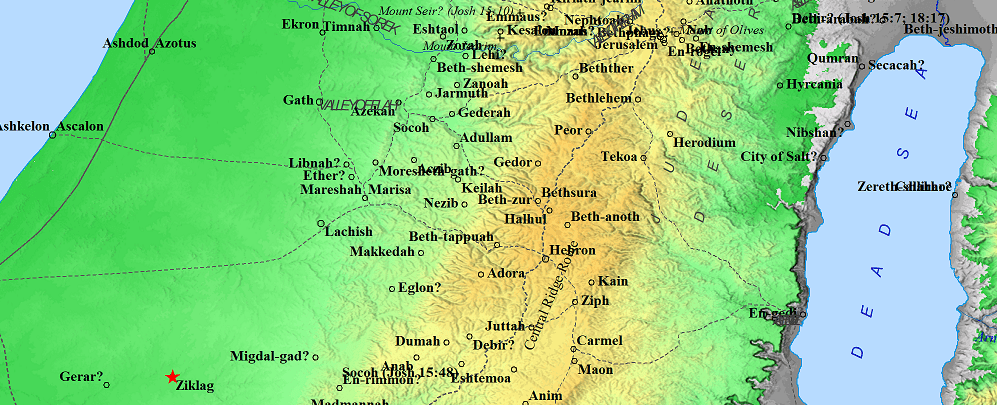 Archeologists and historians have not identified the location of Ziklag specifically, with two or three places being discussed amongst those looking. Generally, the city is thought to be in the south of the land granted to Israel, but at the time of our passage, was under the authority of a Philistine king.