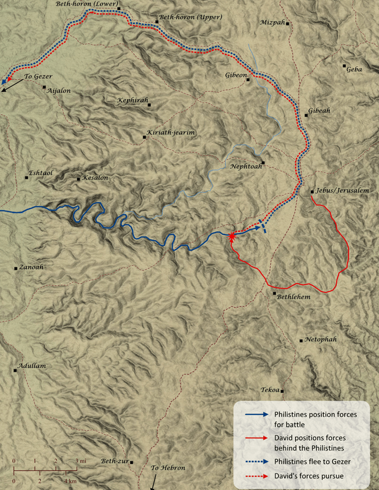 David and his men accomplished a decisive and prolonged victory over the Philistines in this battle. This battle set the tone for David’s domination over the Philistines, eventually bringing the 5 major cities (Gaza, Gath, Ashkelon, Ashdod, and Ekron) of the Philistines under his control.