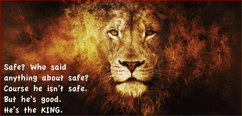 “Aslan is a lion- the Lion, the great Lion.” “Ooh” said Susan. “I’d thought he was a man. Is he-quite safe? I shall feel rather nervous about meeting a lion”…”Safe?” said Mr Beaver …”Who said anything about safe? ‘Course he isn’t safe. But he’s good. He’s the King, I tell you.”